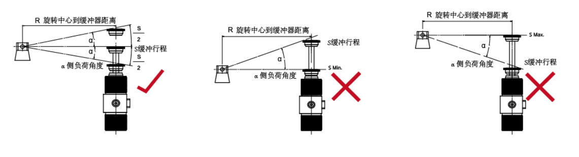 1. 確保安裝工位的支撐強(qiáng)度足夠牢固。 2. 安裝時(shí)保證緩沖器偏心角度小于2°,如大于2°活塞桿承受較大 側(cè)向負(fù)荷,會(huì)發(fā)生不同程度的彎曲, 從而導(dǎo)致活塞桿復(fù)位障礙并且加快密封件的失效, 導(dǎo)致漏油,縮短使用壽命。 3. 緩沖器本體較好建議不作為安全限位裝置使用,把外部安全限位裝置調(diào)整在行程前1mm處較佳。請(qǐng)勿卸下沖擊頭使用,因?yàn)樾读嗣睍?huì)延長(zhǎng)活塞桿,使活塞桿撞到底,造成底部損壞。 4. 務(wù)必旋緊安裝螺母或螺栓,使用螺紋膠更佳,以保證在經(jīng)常的沖擊中不松動(dòng)。 5. 并行使用兩支以上緩沖器時(shí),必須選用同一型號(hào)產(chǎn)品,如可調(diào)型緩沖器需調(diào)至相同檔位。 6. 旋轉(zhuǎn)應(yīng)用時(shí),建議不使用聚氨酯帽,為保證較大的偏心角度在2°以?xún)?nèi),安裝方式需要同時(shí)保證如下兩點(diǎn): 1)旋轉(zhuǎn)中心到緩沖器的距離是緩沖行程的15倍。 2) 按照下圖所示正確的方式安裝:當(dāng)緩沖行程壓縮到一半時(shí), 應(yīng)無(wú)側(cè)向負(fù)荷; 如若安裝條件達(dá)不到上面要求的, 請(qǐng)使用側(cè)負(fù)荷適配器。